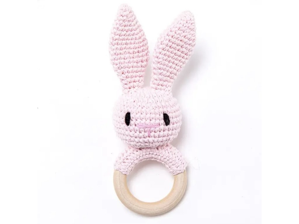 Háčkované chrastítko zajíček, je vyroben z přírodní příze. Uvnitř se nachází rolnička. Chrastítko rozvíjí jemnou motoriku vašeho miminka a je ideální hračkou pro zabavení jak miminek tak batolat. Je navlečený na kroužku z bukového dřeva, které slouží jako kousátko/hryzátko.