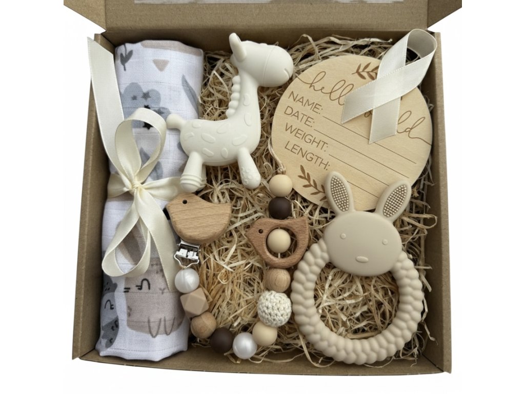 - 🦒 Silikonové kousátko ve tvaru žirafy – podporuje motoriku a úchop miminka